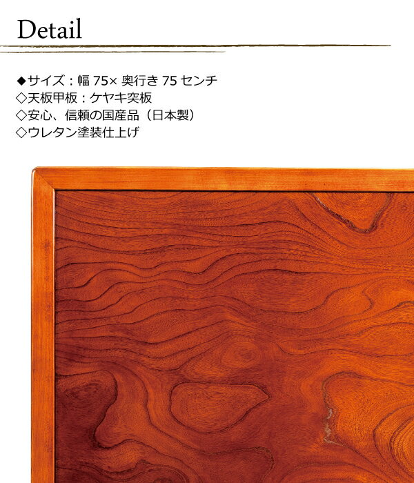◆サイズ:幅75×奥行き75センチチ 縁部分サイズ=幅:約4センチ、厚み約2.5センチ 落し込み(天板からの高さ):約6ミリ(表面、裏面とも) ◇天板甲板:ケヤキ突板 ◇安心、信頼の国産品(日本製) ◇ウレタン塗装仕上げ ※こちらの商品はご注文いただいてから1日〜2日(土日除く)での発送となります ◇このシリーズには「75角正方形」「80角正方形」「85角正方形」「90角正方形」 「105幅長方形」「120幅長方形」「150幅長方形」の7タイプがございます。