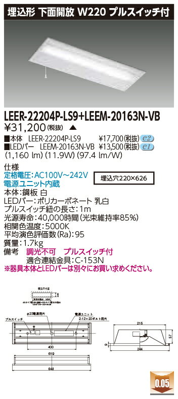 東芝 LEDベースライト TENQOO 埋込形 20タイプ 下面開放W220 プルスイッチ付 高演色1,600lmタイプ HF16形×1灯用高出力形器具相当 昼白色 AC100V〜242V LEDバー付 LEER-22204P-LS9+LEEM-20163N-VB ※受注生産品