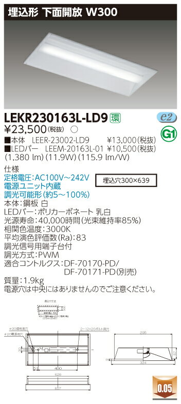 東芝 LEDベースライト TENQOO 埋込形 20タイプ 専用調光器対応 下面開放W300 一般タイプ1,600lmタイプ HF16形×1灯用高出力形器具相当 電球色 AC100V〜242V LEDバー付 LEKR230163L-LD9(LEER23002LD9+LEEM20163L01)