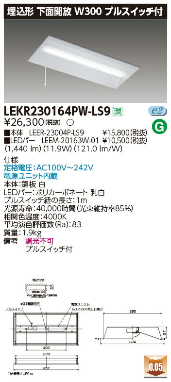 東芝 LEDベースライト TENQOO 埋込形 20タイプ 下面開放W300 プルスイッチ付 一般タイプ1,600lmタイプ HF16形×1灯用高出力形器具相当 白色 AC100V〜242V LEDバー付 LEKR230164PW-LS9(LEER23004PLS9+LEEM20163W01)