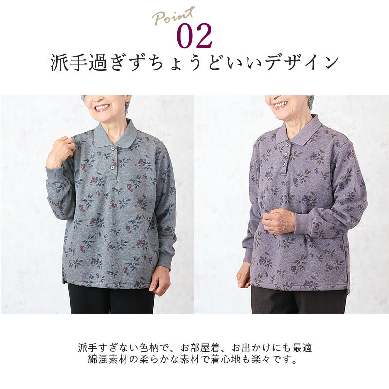 裏起毛花柄ポロシャツ (シニアファッション レディース 80代 秋冬 70代 60代 ミセス おばあちゃん 服 プレゼント 高齢者 祖母 誕生日 送料無料)(婦人服 上品 ミセスファッション) 暖かい 防寒 あったか 母の日 プレゼント 実用的 ギフト 花以外 2021